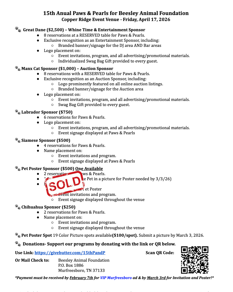 Beesley Animal Foundation's 11th Annual Paws & Pearls is set for Saturday, September 17th at 6:00 pm at The Grove at Williamson Family Farm. This event is 3+ years in the making! Our last Paws and Pearls was a HUGE success in April of 2019. We hope you will join us for the night to have fun while supporting Beesley Animal Foundation.