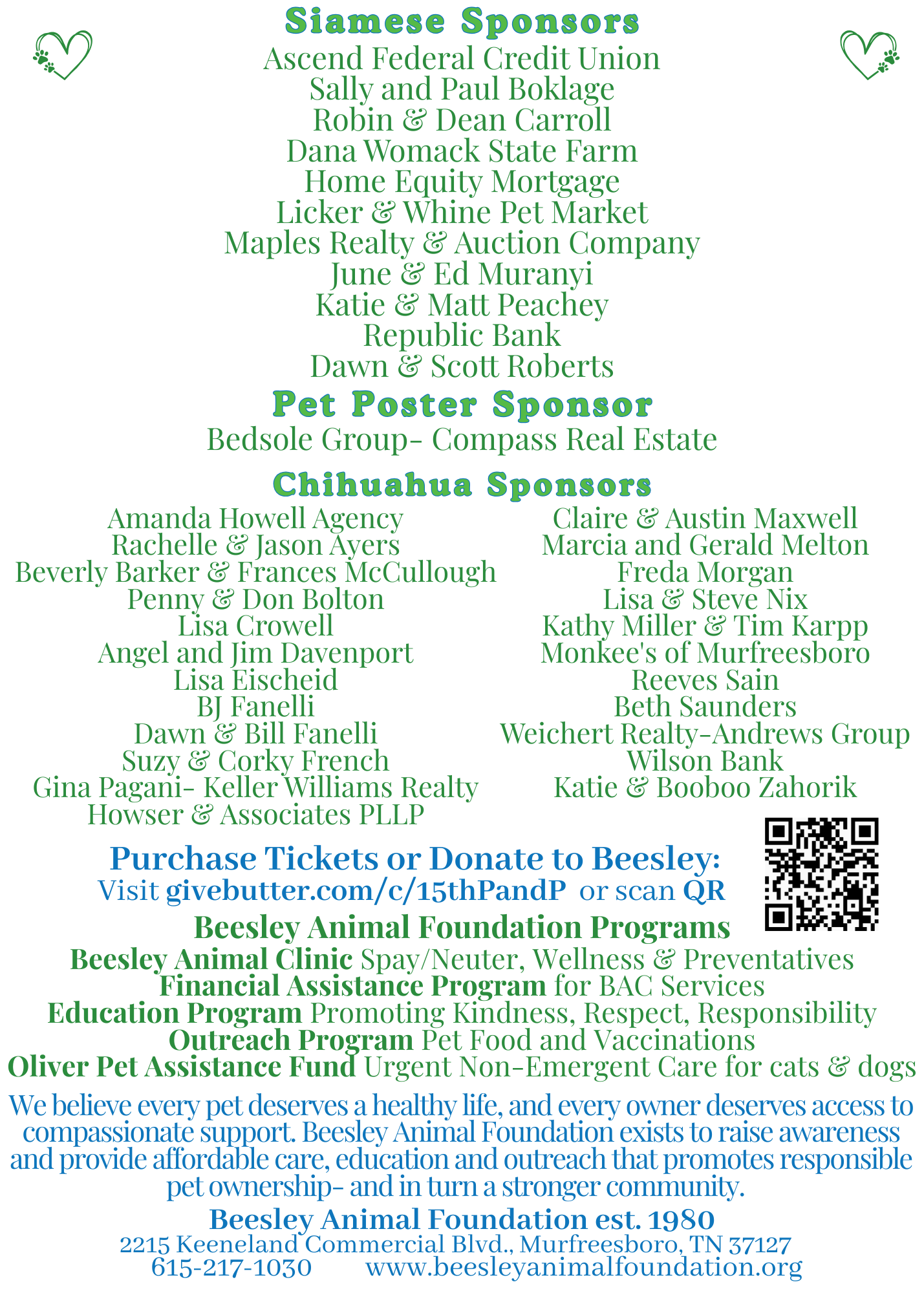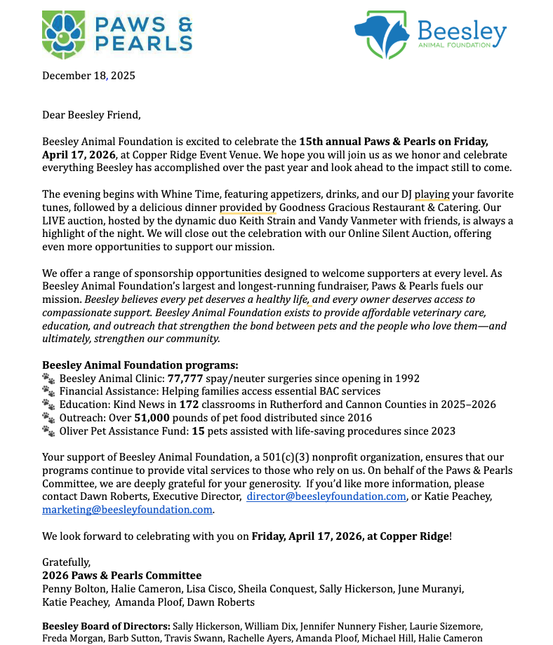 Paws & Pearls is the largest and longest-running fundraiser supporting all Beesley Animal Foundation programs.