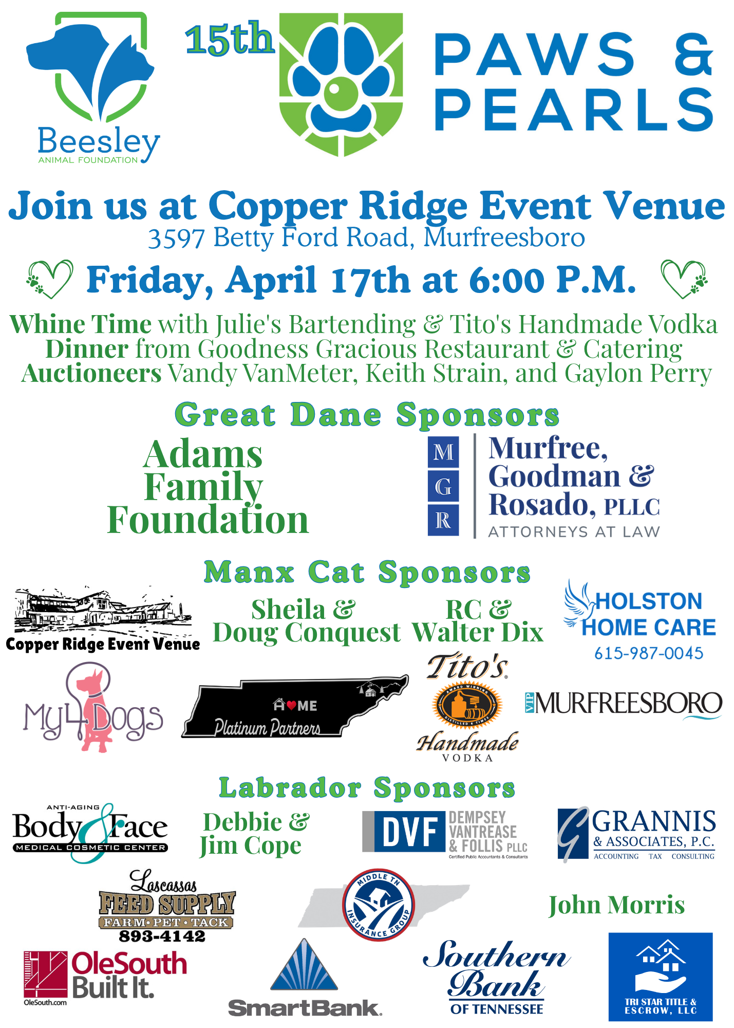 The evening starts with fabulous silent auction items and enjoying cocktails served by Julie's Bartending from Tito's Handmade Vodka and wine from Murfreesboro Wine and Spirits during Whine Time all while listening to the beautiful voice of Templeton Thompson. Goodness Gracious Cafe and Catering is providing delicious appetizers and dinner! And, Licker & Whine Pet Market will have treats for your pets. There are a LOT of wonderful Silent AND Live Auction items and our every popular Whine and Licker Pull! We end the evening with The Jeff Woods Band playing dancing music to rock away the night!