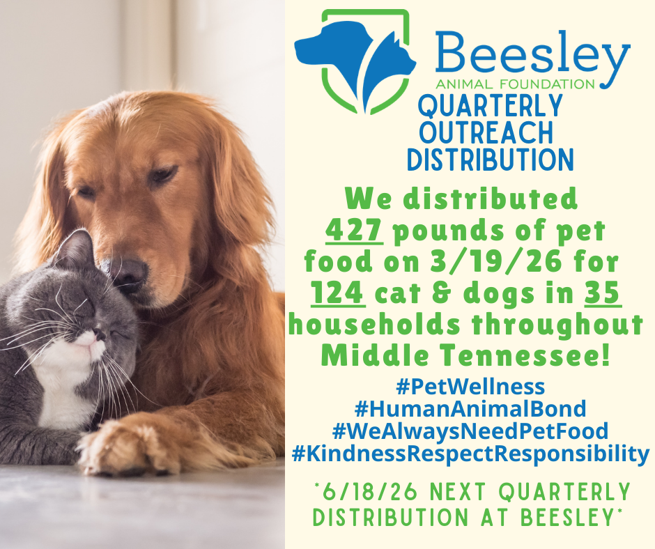 In addition to our Quarterly Pet Food Distributions, cat and dog food is available Monday–Thursday during business hours at Beesley Animal Clinic.