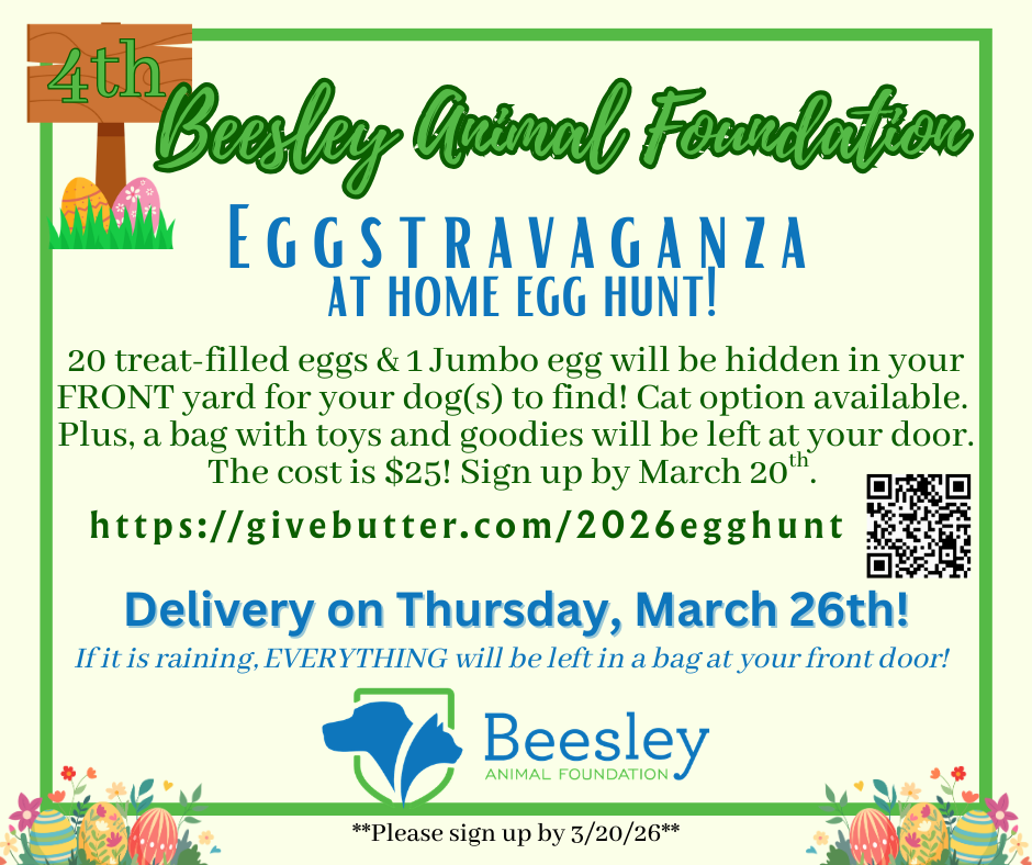 Your yard will be filled with treat-stuffed eggs AND a goody bag will be left at your front door. You can order as many Dog and/or Cat Egg Hunts as you like. Have fun with your pets all while you support Beesley Animal Foundation!🐾❤